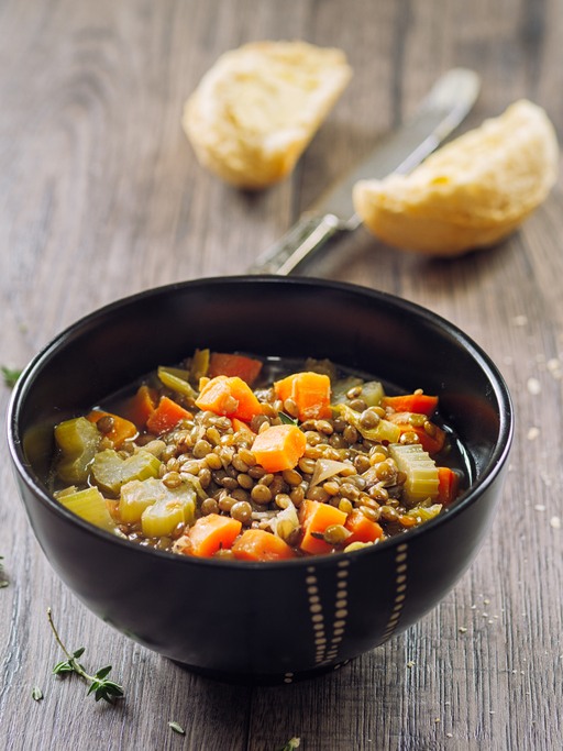 - Saute minced garlic cloves and diced onion with Avocado oil in a soup pot. You can add salt & pepper as well. 2. Once onion is soft add lentils, carrots, potatoes, celery, and about 3 cups of vegetable broth. 3. Bring to a boil and vegetable broth as needed. Cook for 20-25 minutes!4. Once cooked, open a can of full fat coconut milk and add to the pot. Stir in the milk, serve, and enjoy!